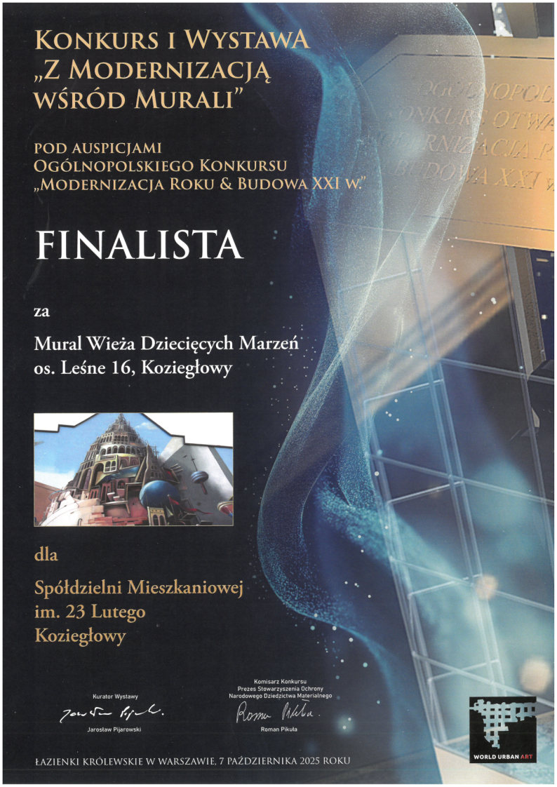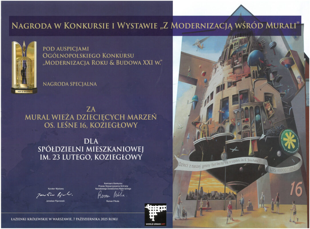 Z przyjemnością informujemy, że Spółdzielnia Mieszkaniowa im. 23 Lutego w Koziegłowach została uhonorowana Nagrodą Specjalną w konkursie i wystawie „Z Modernizacją wśród Murali”, organizowanej pod auspicjami Ogólnopolskiego Konkursu „Modernizacja Roku & Budowa XXI w.”