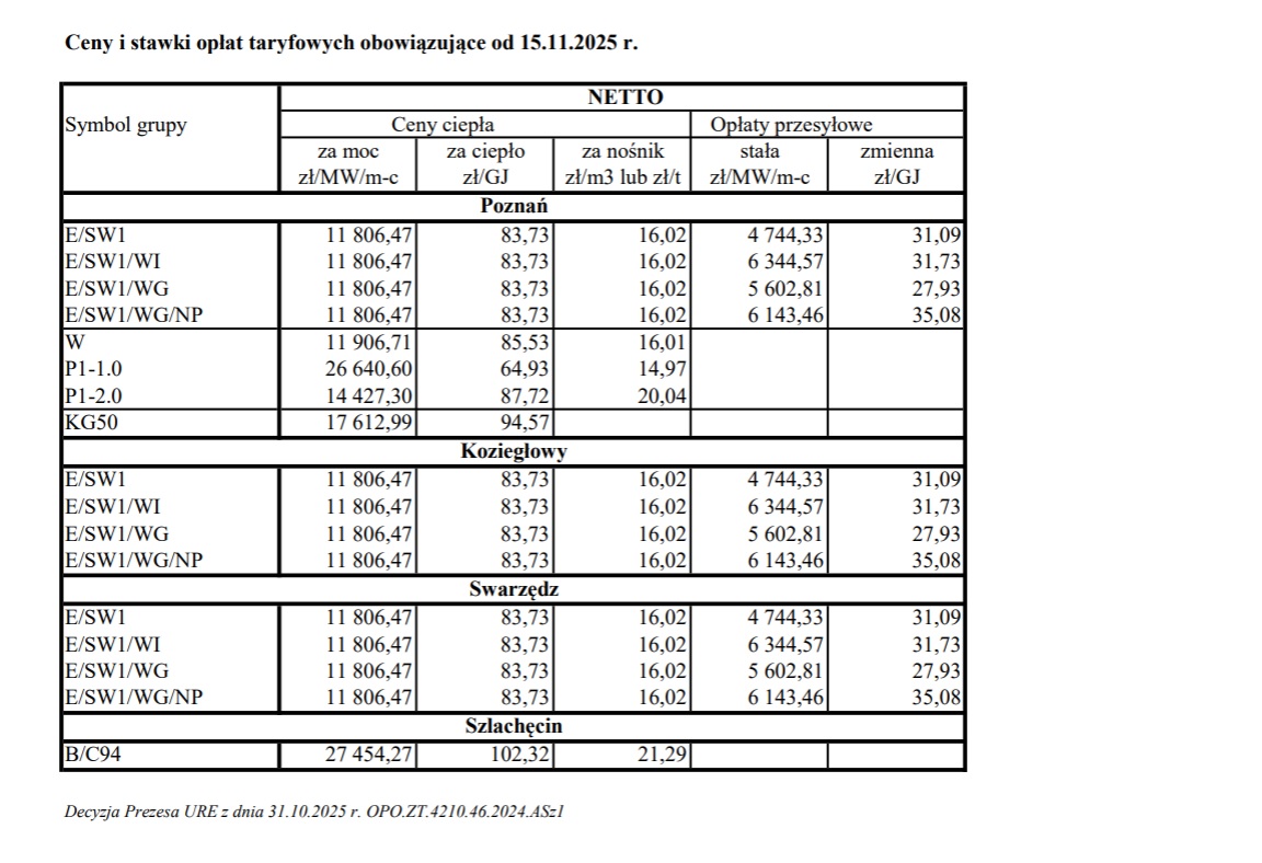 VEOLIA ENERGIA POZNAŃ S.A. informuje, że na podstawie decyzji Prezesa Urzędu Regulacji Energetyki, ulegają zmianie ceny i stawki w zakresie wytwarzania, przesyłania i dystrybucji ciepła (decyzja z dnia 31.10.2025 r. OPO.ZT.4210.46.2024.ASz1). Nowe ceny i stawki opłat za ciepło obowiązują od dnia 15.11.2025r. dla mieszkańców naszych zasobów w Koziegłowach oraz w Poznaniu.